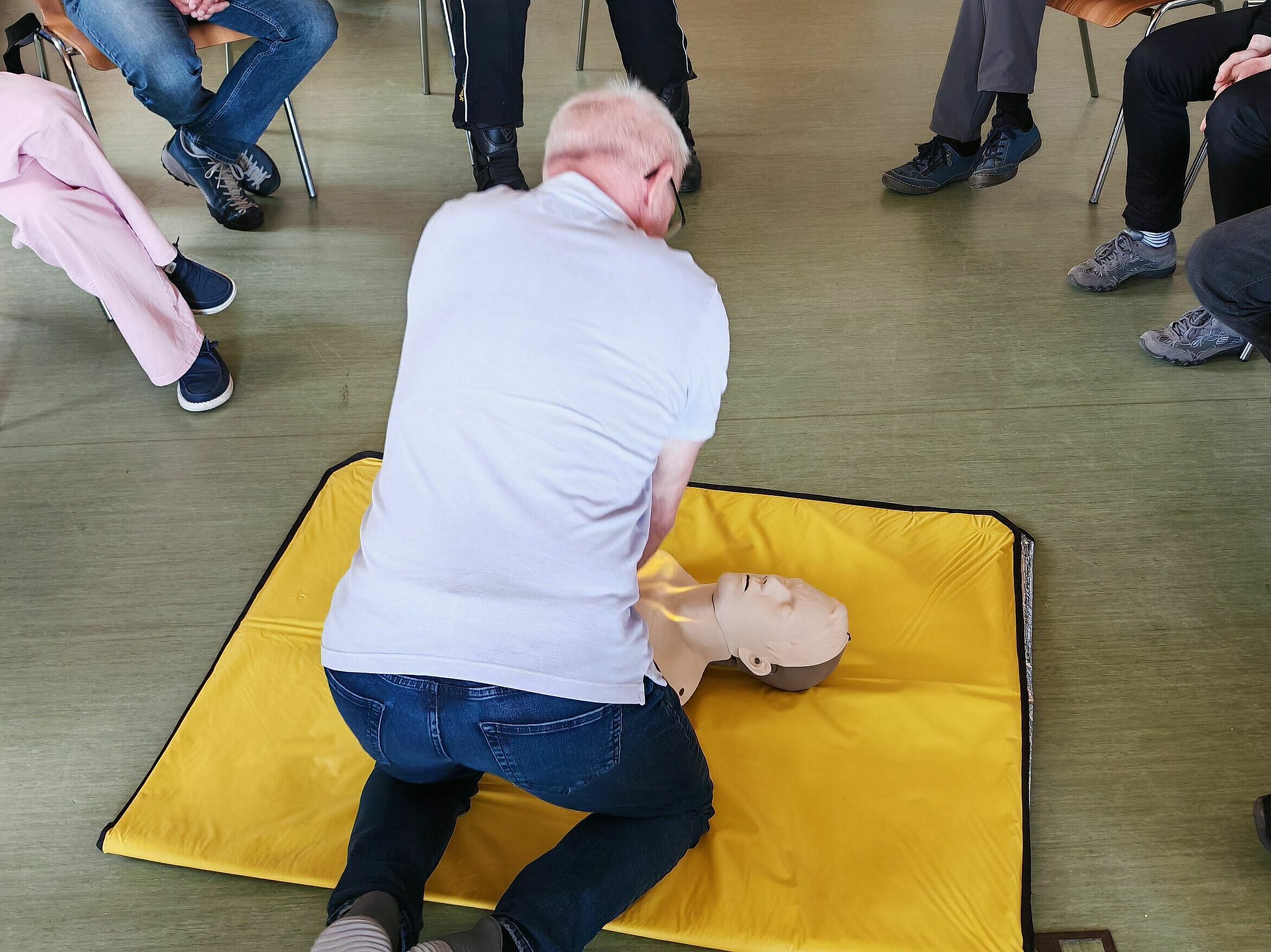 Am Vormittag wurden die Kenntnisse in Erster Hilfe wieder aufgefrischt. Nach der Mittagspause ging es um die Begleitung blinder Menschen, den Umgang mit Rollstuhl und Rollator und zu guter Letzt um die Hilfestellung bei Menschen mit Spastiken.